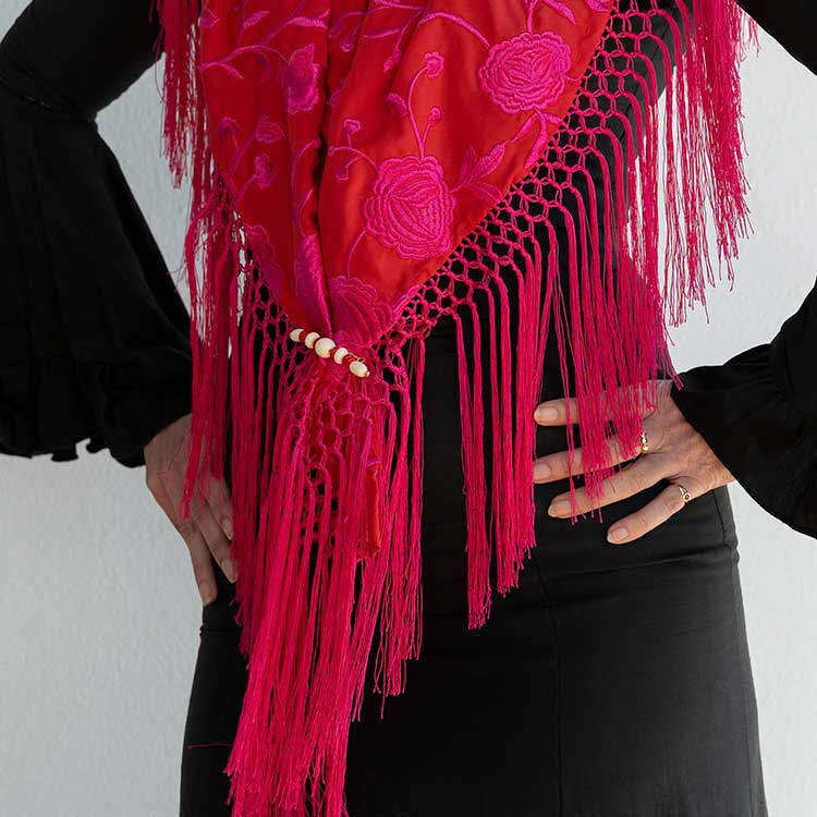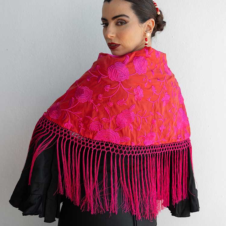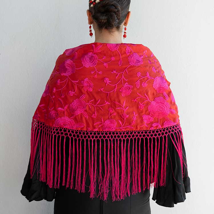 Mantón Rojo Bordado En Fucsia Con Enrejado De Flecos De Seda Hecho a Mano En Cantillana.